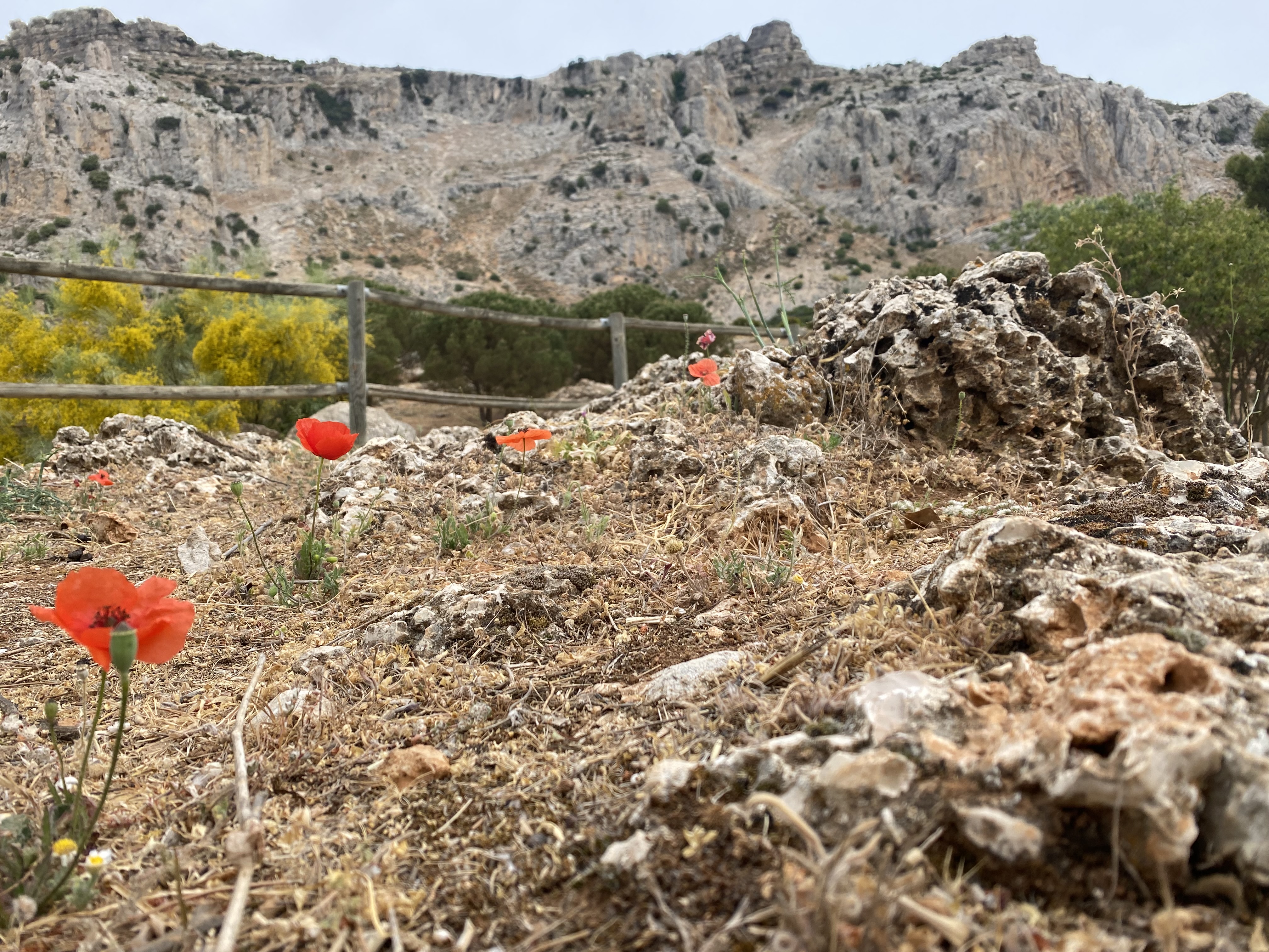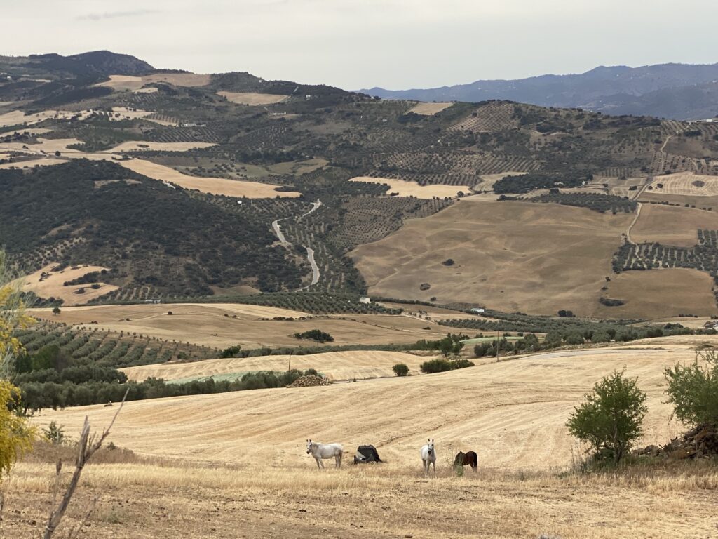 Villanueva de la Concepción, now behind us, looked tiny as we passed a few horses in the mountains along with several cars and a water truck at the summit of El Torcal, all of them taking a break and enjoying the scenery. How do I break into the water truck to get a drink?