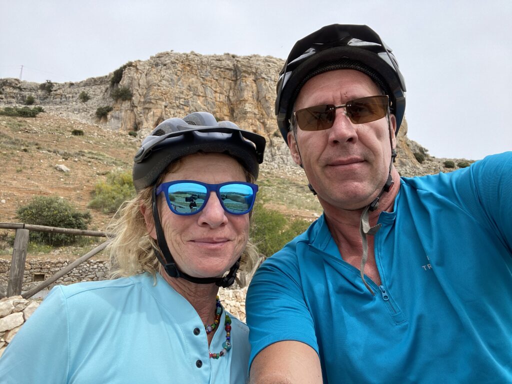 In the distance high above the valley floor we can see a faint outline of the road on the mountain. We’re gaining altitude each day according to my Garmin watch and burning quads. Leg wise however, today is a breeze compared to yesterday and the buns are not quite steel yet, but a mild form of malleable copper.