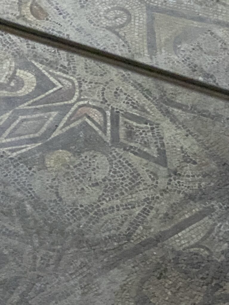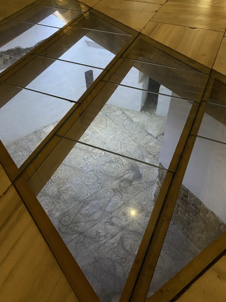 A glass window on the floor exposes the caverns and tiles of antiquity beneath the current structure.